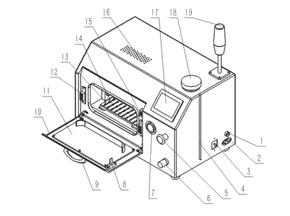 17)触摸屏         18)储液罐       19)工作指示灯